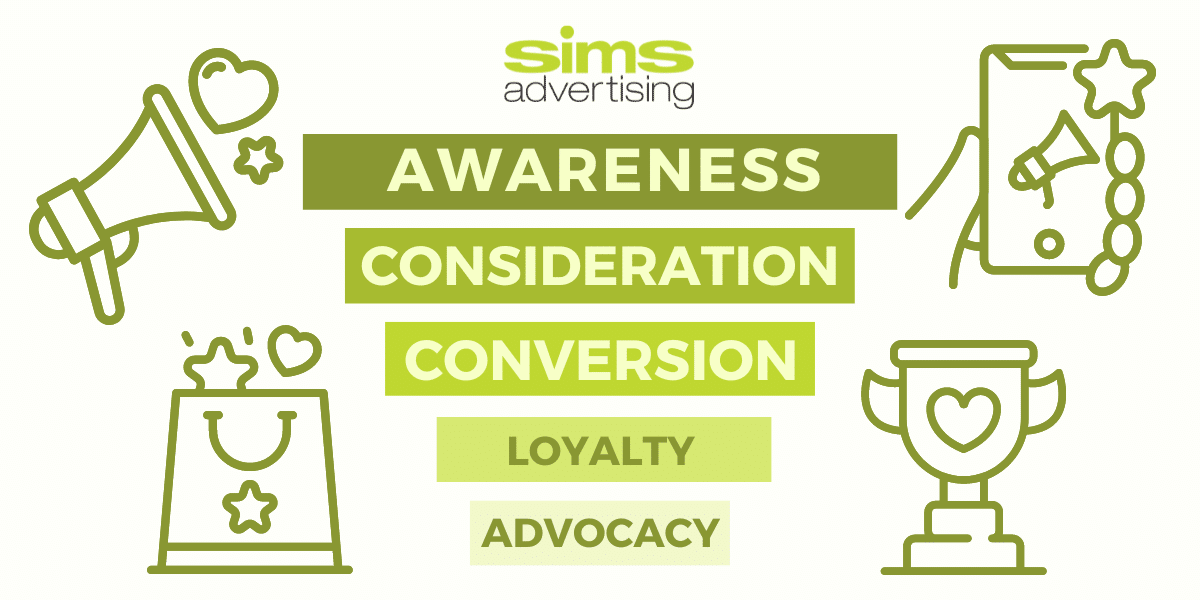 There are five stages of the funnel. From top to bottom: awareness, consideration, conversion, loyalty and advocacy. The closer you get to the bottom, the closer you are to earning new business or increasing revenue. Loyalty and advocacy are significant because they can influence valuable repeat purchases and allows happy customers to refer new potential customers… thus adding new customers to the funnel on your behalf.